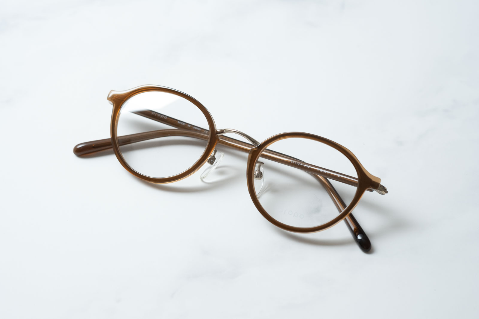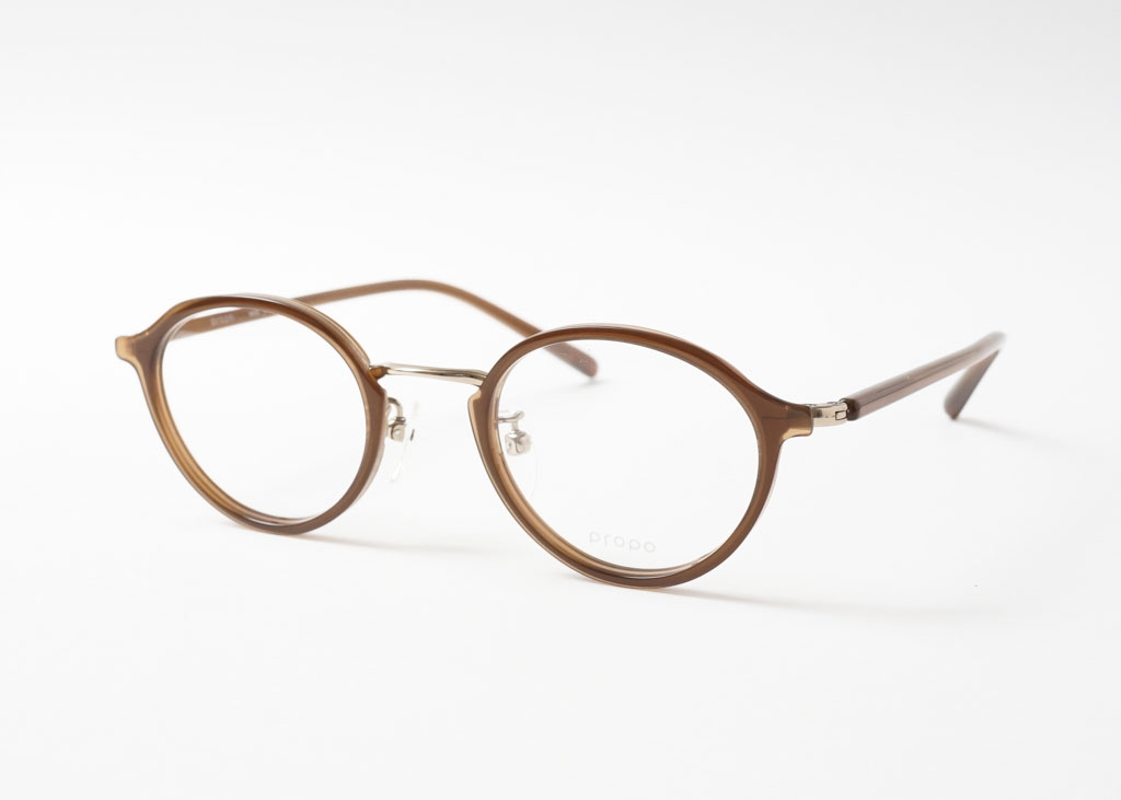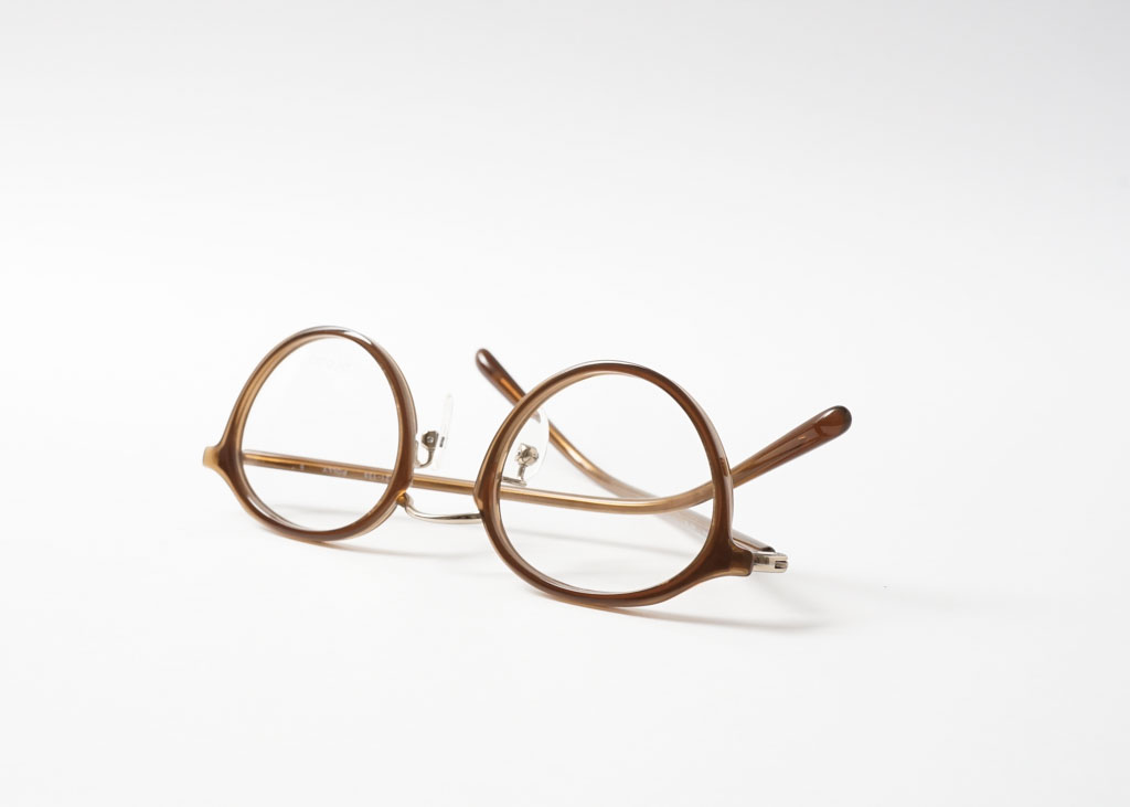 天地幅を抑えたボストンとオーバルの中間位のレンズシェイプです。コンビネーションフレームとしては珍しい小振りなサイズ感となっております。フロントは溝を掘ったアセテートリムをメタル枠で包んだ製法。程よく透け感があり、横からの見た目も女性らしい仕上がりとなっております。