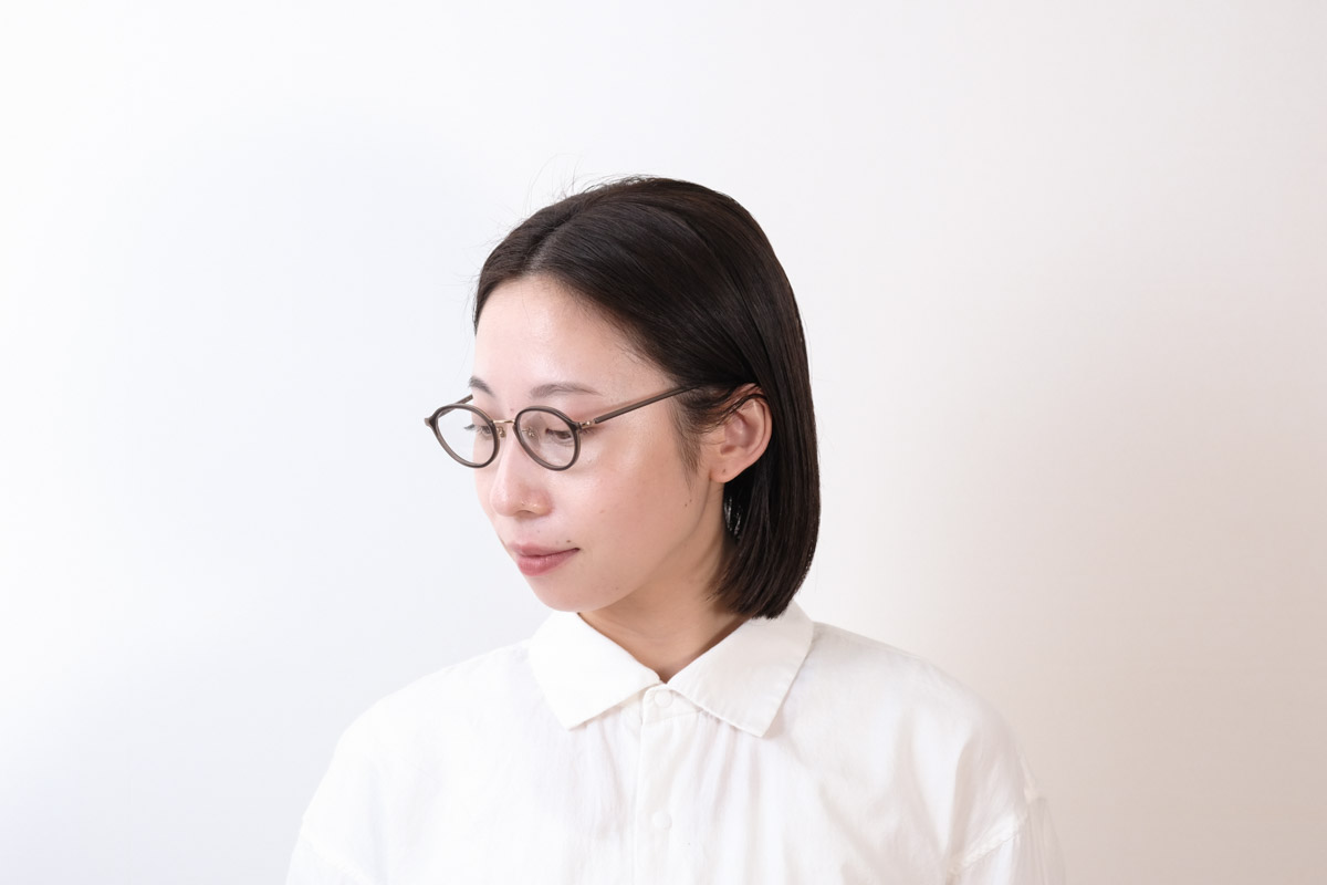 天地幅を抑えたボストンとオーバルの中間位のレンズシェイプです。コンビネーションフレームとしては珍しい小振りなサイズ感となっております。フロントは溝を掘ったアセテートリムをメタル枠で包んだ製法。程よく透け感があり、横からの見た目も女性らしい仕上がりとなっております。