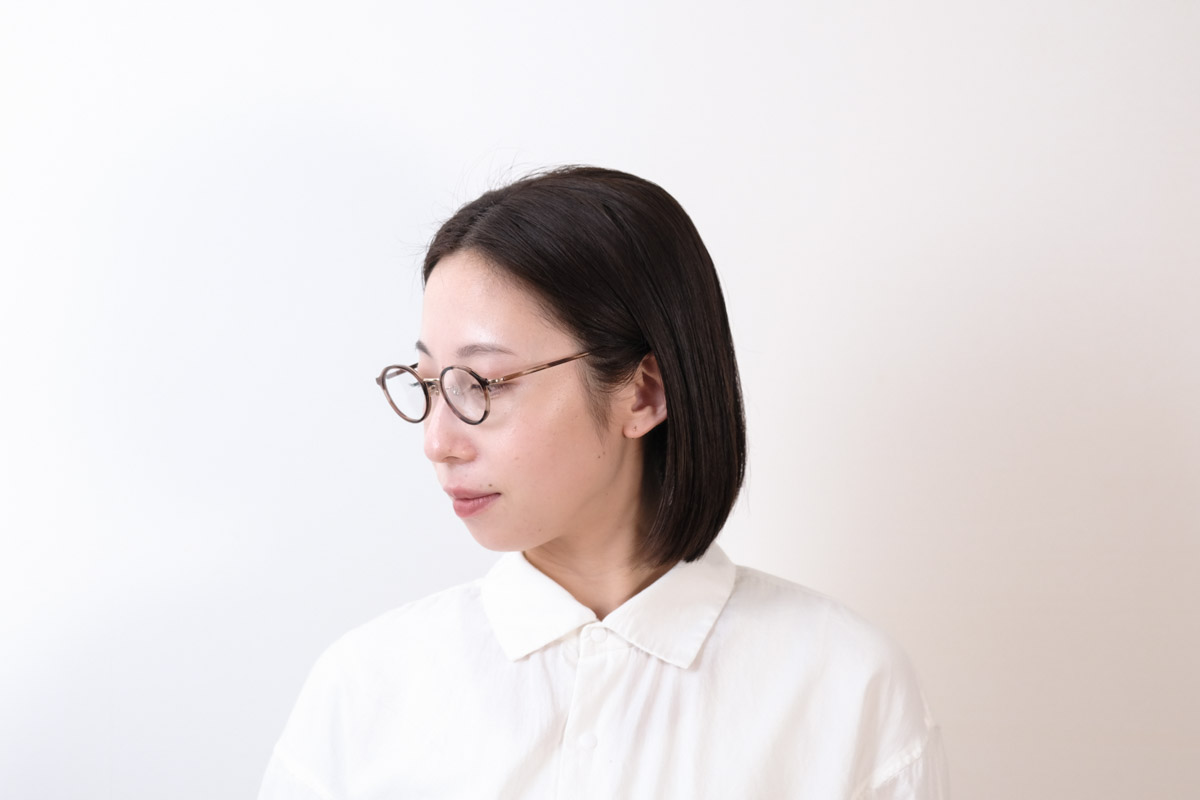 天地幅を抑えたボストンとオーバルの中間位のレンズシェイプです。コンビネーションフレームとしては珍しい小振りなサイズ感となっております。フロントは溝を掘ったアセテートリムをメタル枠で包んだ製法。程よく透け感があり、横からの見た目も女性らしい仕上がりとなっております。