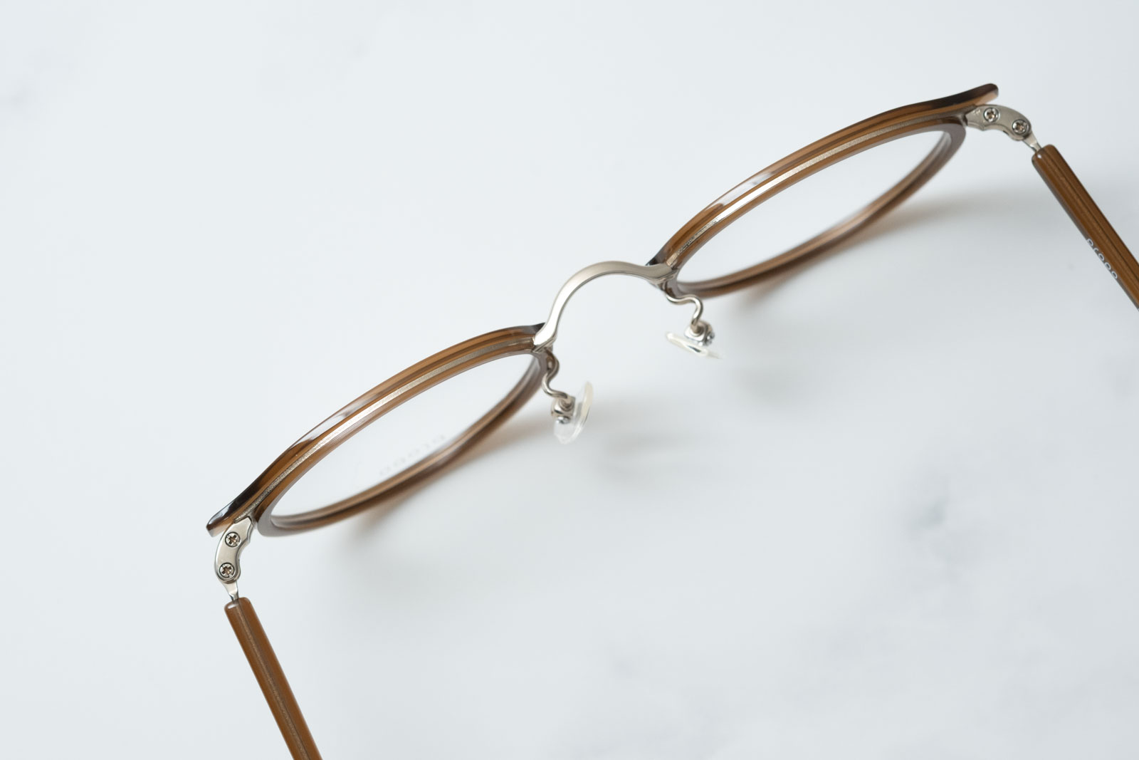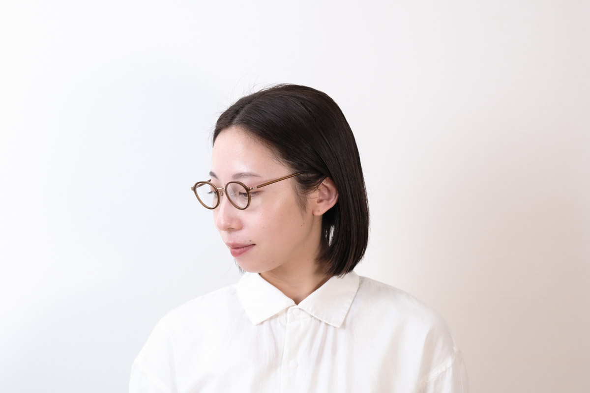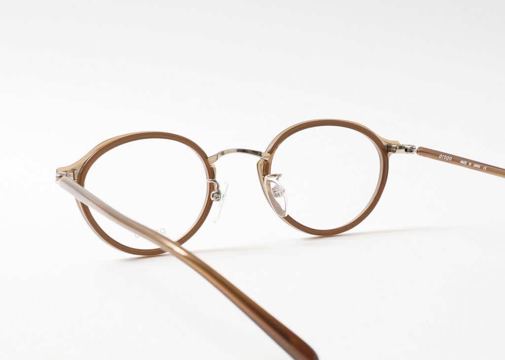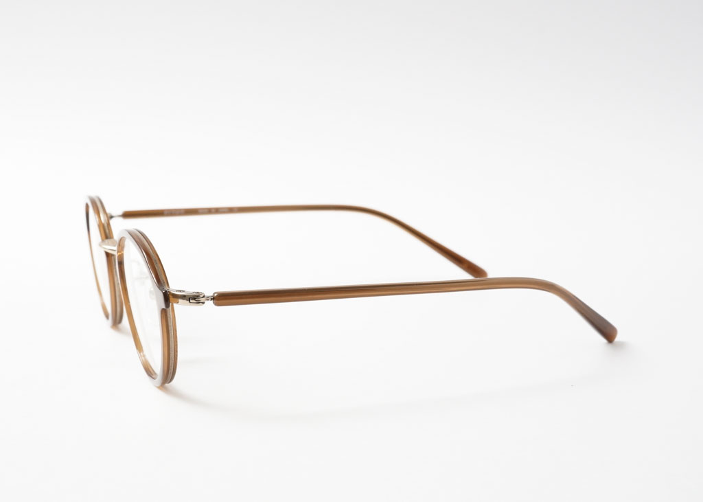 天地幅を抑えたボストンとオーバルの中間位のレンズシェイプです。コンビネーションフレームとしては珍しい小振りなサイズ感となっております。フロントは溝を掘ったアセテートリムをメタル枠で包んだ製法。程よく透け感があり、横からの見た目も女性らしい仕上がりとなっております。